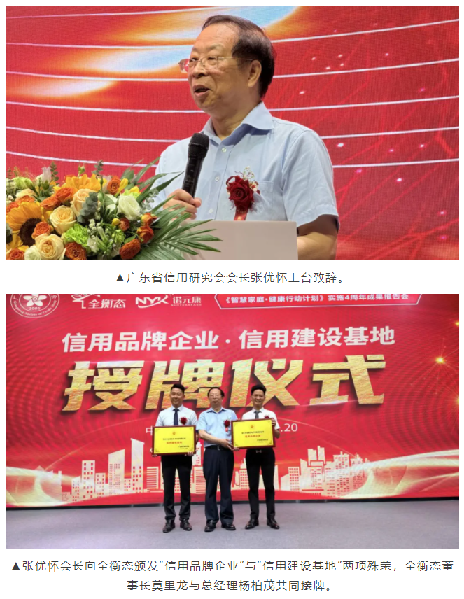 在楊總發(fā)言結(jié)束后,廣東省信用研究會會長張優(yōu)懷先生受邀登臺致辭。他高度肯定了全衡態(tài)在誠信經(jīng)營、社會責(zé)任及品牌建設(shè)中的卓越表現(xiàn),并強(qiáng)調(diào):“全衡態(tài)始終以客戶健康為核心,以科技為驅(qū)動,將信用理念融入企業(yè)發(fā)展的每一步,是行業(yè)內(nèi)的標(biāo)桿典范。”隨后,張優(yōu)懷會長代表研究會向全衡態(tài)頒發(fā)“信用品牌企業(yè)”與“信用建設(shè)基地”兩項(xiàng)殊榮,董事長莫里龍與總經(jīng)理?xiàng)畎孛餐优啤,F(xiàn)場掌聲如潮,這一榮譽(yù)不僅是對企業(yè)誠信的肯定,更彰顯了全衡態(tài)在行業(yè)信用體系建設(shè)中的引領(lǐng)地位。